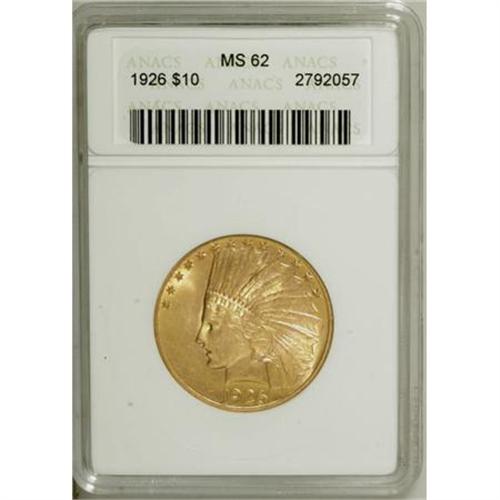 <B>1926 $10 MS62 ANACS.</B></I> NGC Census: (7355/10670). PCGS Population (7982/8712). Mintage: 1,014,000. Numismedia Wsl. Price for NGC/PCGS coin in MS62: $835. (#8882)<BR><BR><B>Coin Engraver:</B> Augustus Saint-Gaudens<BR><BR><b>Shipping:</b> Coins & Currency (<a target="_blank" href="http://www.heritageauctions.com/common/shipping.php">view shipping information</a>\)