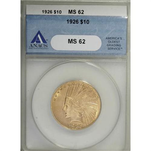 <B>1926 $10 MS62 ANACS.</B></I> . NGC Census: (7688/11216). PCGS Population (8179/9243). Mintage: 1,014,000. Numismedia Wsl. Price for NGC/PCGS coin in MS62: $805. (#8882)<BR><BR><B>Coin Engraver:</B> Augustus Saint-Gaudens<BR><BR><b>Shipping:</b> Coins & Currency (<a target="_blank" href="http://www.heritageauctions.com/common/shipping.php">view shipping information</a>)