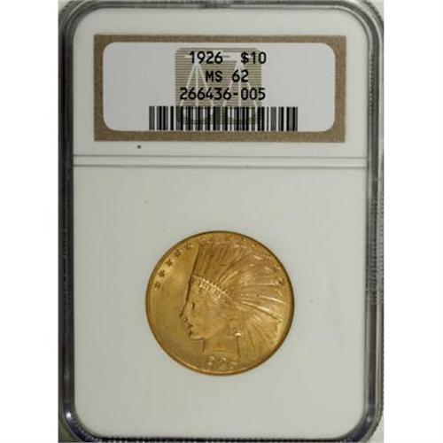 <B>1926 $10 MS62 NGC.</B></I> NGC Census: (7447/10832). PCGS Population (8088/8997). Mintage: 1,014,000. Numismedia Wsl. Price for NGC/PCGS coin in MS62: $835. (#8882)<BR><BR><B>Coin Engraver:</B> Augustus Saint-Gaudens<BR><BR><b>Shipping:</b> Coins & Currency (<a target="_blank" href="http://www.heritageauctions.com/common/shipping.php">view shipping information</a>)