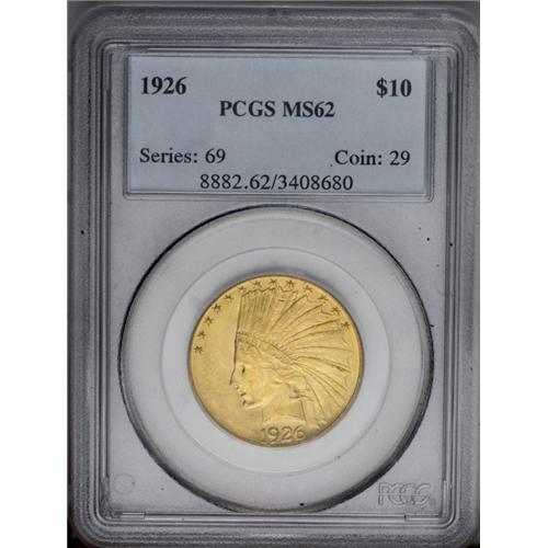 <B>1926<$10> MS62 PCGS.</B></I> This well struck green-gold type coin possesses full luster, and although small marks are distributed, none deny the eye appeal. <BR><BR><B>Important notice:</B> Heritage usually auctions material at the rate of 200-250 lots per hour. On some occasions eBay Live bid software or the Internet may not be able to keep up with the pace of the auction. We recommend placing a realistic absentee bid now as insurance to avoid disappointment. Occasionally the auctioneer may eliminate or reject an eBay Live bid, and the auctioneer may also reopen a lot after the close of the eBay live bidding (usually because we missed an audience bid), and may reject your bid even if it shows you as the winning bidder. By bidding via eBay Live, you agree that Heritage may award the lot to another bidder at its sole discretion under the circumstances described above or any other reasonable circumstances. Since eBay bids are not shown to us until we open the lot on the floor, we treat those bids just like floor bids. In most cases the floor responds before the eBay bid is presented to us, due to Internet lag time, so for consistency we have made it a policy that floor bids are always considered first over tie eBay live bids. Also please note that all Heritage lots purchased through eBay Live carry a 20% Buyer's Premium. Please make sure you read the Terms and Conditions before you bid. This lot is being auctioned in conjunction with a live floor auction by Heritage Galleries & Auctioneers. All final auction and invoice information will be supplied by Heritage Galleries & Auctioneers, and all other information should be considered preliminary. Lot:4142 <BR><BR><B>Winning Notification and Billing:</B> After the FINAL session in this auction is complete, Heritage will send e-mail and snail mail invoices. This process normally takes several days. All final auction and invoice information will be supplied by Heritage Galleries & Auctioneers, and all other information should be considered preliminary. <BR><BR>This auction will be conducted on a live auction floor and over the Internet through eBay Live. If you choose to place an absentee bid, please take a moment to <font color='#0000ff'><u><a href='http://pages.ebay.com/liveauctions/help/before/laabsentee.html'>learn how eBay Live absentee bidding works</a></u></font><font color='#000000'>