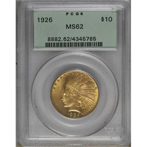 <B>1926 $10 MS62 PCGS.</B></I> PCGS Population (8253/9400). NGC Census: (7822/11277). Mintage: 1,014,000. Numismedia Wsl. Price for NGC/PCGS coin in MS62: $805. (#8882)<BR><BR><B>Coin Engraver:</B> Augustus Saint-Gaudens<BR><BR><b>Shipping:</b> Coins & Currency (<a target="_blank" href="http://www.heritageauctions.com/common/shipping.php">view shipping information</a>)