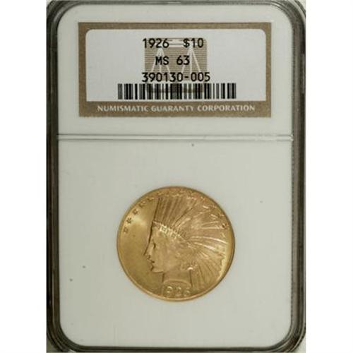 <B>1926 $10 MS63 NGC.</B></I> NGC Census: (7151/3519). PCGS Population (6369/2343). Mintage: 1,014,000. Numismedia Wsl. Price for NGC/PCGS coin in MS63: $1,460. (#8882)<BR><BR><b>Shipping:</b> Coins & Currency (<a target="_blank" href="http://www.heritageauctions.com/common/shipping.php">view shipping information</a>)