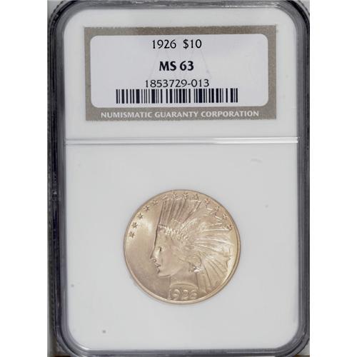 <B>1926 $10 MS63 NGC.</B></I> Well struck with lustrous yellow-gold fields. The surfaces are generally clean, but a single heavy abrasion on Liberty's cheek firmly limits the grade.<BR><BR><b>Shipping:</b> Coin/Currency (<a target="_blank" href="http://www.heritageauctions.com/common/shipping.php">view shipping information</a>)
