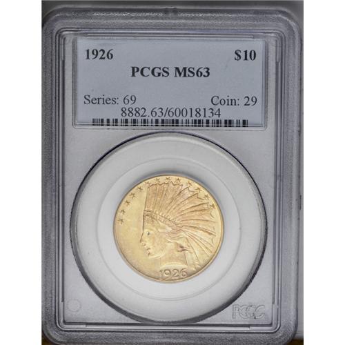 <B>1926<$10> MS63 PCGS.</B></I> A frosty Mint State example with light yellow color on the obverse and deeper honey-gold on the reverse. Both sides have hints of lighter pinkish color.
