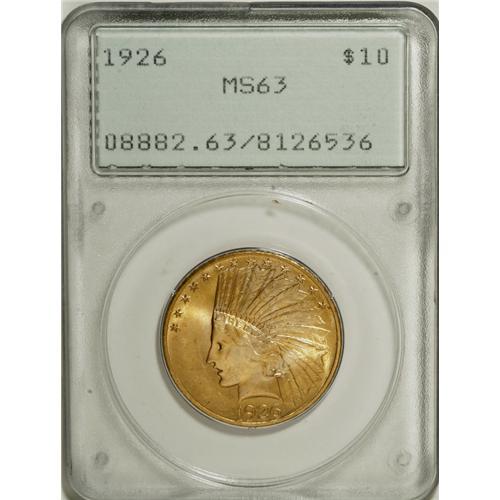 <B>1926 $10 MS63 PCGS.</B></I> The 1926 eagle provides a convenient alternative to the ubiquitous 1932 eagle and its prodigious mintage. This piece offers radiant, lustrous yellow-gold surfaces with strong appeal, despite light reverse field haze. Certified in a small-size first-generation holder.<BR><BR><b>Shipping:</b> Coins & Currency (<a target="_blank" href="http://www.heritageauctions.com/common/shipping.php">view shipping information</a>)