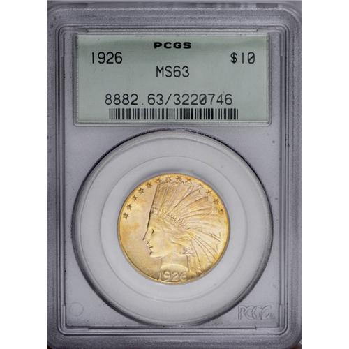 <B>1926<$10> MS63 PCGS.</B></I> This coin offers considerable "flash," which is complemented by nicely struck devices. The surfaces are a blend of peach and orange-gold patina, and display a few grade-limiting marks, especially on the obverse.