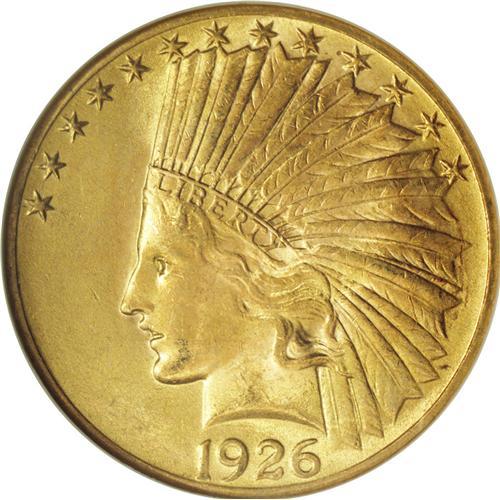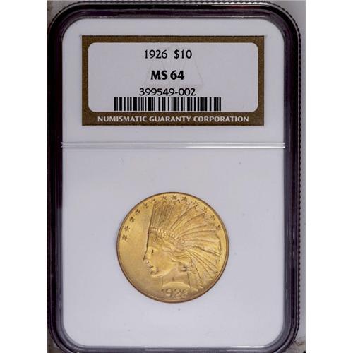 <B>1926<$10> MS64 NGC.</B></I> A pleasing display of deep orange-gold, rose, and greenish coloration adorns the shimmering, matte-like surfaces. Scattered superficial marks limit the grade but have little effect on the overall eye appeal of this visually enticing near-Gem.