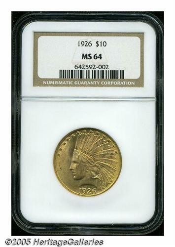 <B>1926<$10> MS64 NGC.</B></I> Boldly struck with bright pink-orange and straw-gold surfaces that are modestly abraded on both sides.