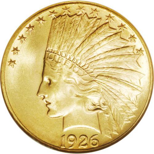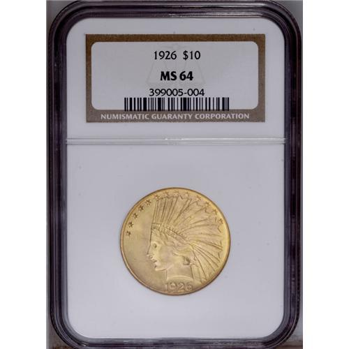 <B>1926 $10 MS64 NGC.</B></I> Booming luster and extremely attractive pinkish-gold toning cover both sides of this piece, with deeper red around the rims. Examination under a loupe reveals a small number of minor contact marks, consistent with the grade.