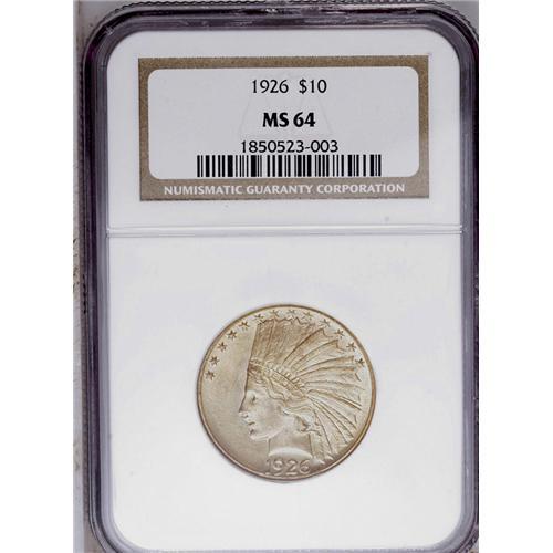<B>1926<$10> MS64 NGC.</B></I> Brilliant and highly lustrous with hints of honey-gold patina. A few scattered abrasions are seen on the reverse that limit the grade to MS64.