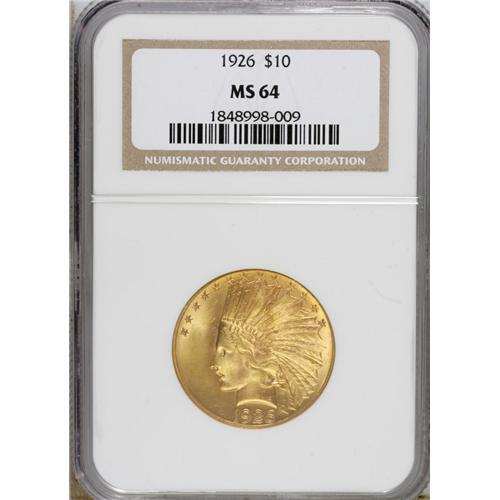<B>1926 $10 MS64 NGC.</B></I> Lustrous peach-gold surfaces exhibit sharply defined devices. The scattering of small contact marks over both sides is the usual case for this issue, which sees more than its fair share of abrasions. Still attractive for the grade.<BR><BR><b>Shipping:</b> Coins & Currency (<a target="_blank" href="http://www.heritageauctions.com/common/shipping.php">view shipping information</a>)
