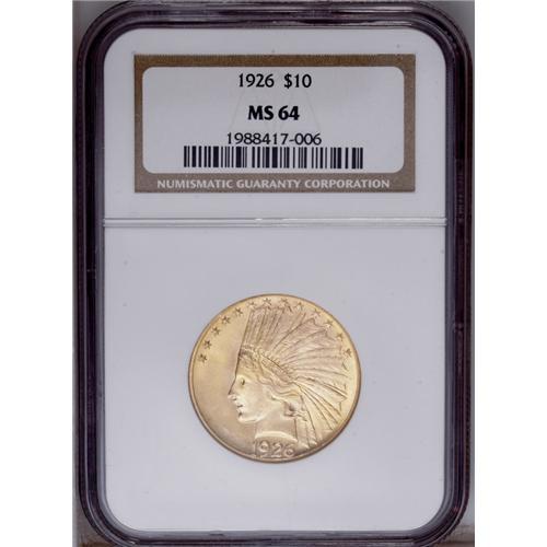 <B>1926 $10 MS64 NGC.</B></I> One of the more common issues in near-Gem with coruscant luster that immediately dominates the eye appeal. As one would expect, several light marks do exist, but seem trivial due to the exceptional look.