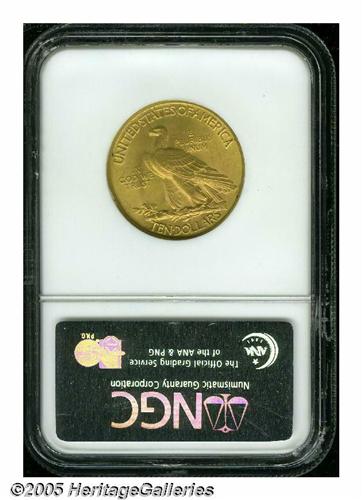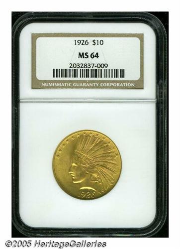 <B>1926<$10> MS64 NGC.</B></I> Slightly soft on Liberty's upper hair detail, and on the eagle's breast feather definition, with very pleasing, softly frosted luster, pale peach and yellow-green coloration, and two or three minor contact marks near the center of each side.<BR><I>From the Dr. Kurt Peters Collection.</B></I> From the Dr. Kurt Peters Collection.