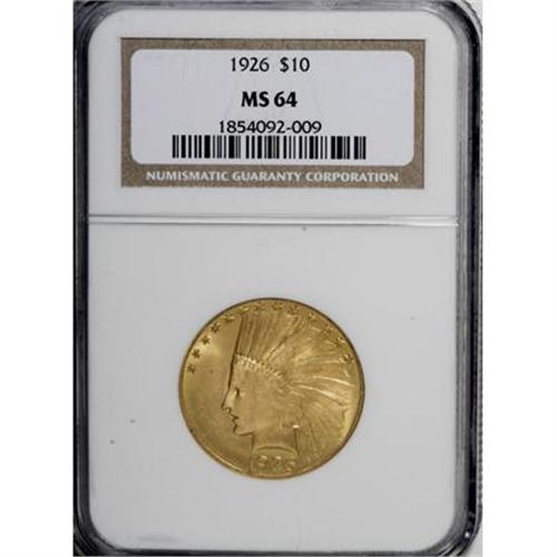 <B>1926 $10 MS64 NGC.</B></I> This Choice eagle has an evenly struck olive branch, unlike many examples of the type. Other design elements are also well struck, aside from a hint of blending on the left border of the eagle's wing. A highly lustrous and attractive yellow-gold representative.<BR><BR><B>Coin Engraver:</B> Augustus Saint-Gaudens<BR><BR><b>Shipping:</b> Coins & Currency (<a target="_blank" href="http://www.heritageauctions.com/common/shipping.php">view shipping information</a>)