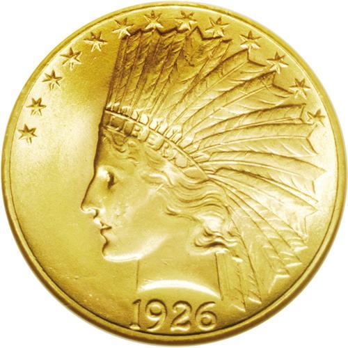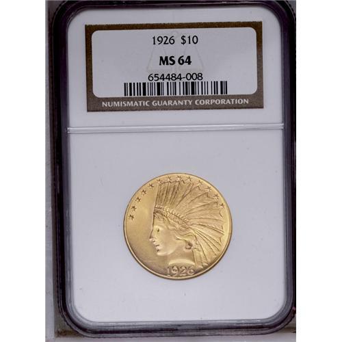 <B>1926<$10> MS64 NGC.</B></I> A brilliant, two-toned rose-gold example of this readily available date, in an eye-appealing condition. The few light marks seen are consistent with the near-Gem assessment. <BR><BR><B>Important notice:</B> Heritage usually auctions material at the rate of 200-250 lots per hour. On some occasions eBay Live bid software or the Internet may not be able to keep up with the pace of the auction. We recommend placing a realistic absentee bid now as insurance to avoid disappointment. Occasionally the auctioneer may eliminate or reject an eBay Live bid, and the auctioneer may also reopen a lot after the close of the eBay live bidding (usually because we missed an audience bid), and may reject your bid even if it shows you as the winning bidder. By bidding via eBay Live, you agree that Heritage may award the lot to another bidder at its sole discretion under the circumstances described above or any other reasonable circumstances. Since eBay bids are not shown to us until we open the lot on the floor, we treat those bids just like floor bids. In most cases the floor responds before the eBay bid is presented to us, due to Internet lag time, so for consistency we have made it a policy that floor bids are always considered first over tie eBay live bids. Also please note that all Heritage lots purchased through eBay Live carry a 20% Buyer's Premium. Please make sure you read the Terms and Conditions before you bid. This lot is being auctioned in conjunction with a live floor auction by Heritage Galleries & Auctioneers. All final auction and invoice information will be supplied by Heritage Galleries & Auctioneers, and all other information should be considered preliminary. Lot:4148 <BR><BR><B>Winning Notification and Billing:</B> After the FINAL session in this auction is complete, Heritage will send e-mail and snail mail invoices. This process normally takes several days. All final auction and invoice information will be supplied by Heritage Galleries & Auctioneers, and all other information should be considered preliminary. <BR><BR>This auction will be conducted on a live auction floor and over the Internet through eBay Live. If you choose to place an absentee bid, please take a moment to <font color='#0000ff'><u><a href='http://pages.ebay.com/liveauctions/help/before/laabsentee.html'>learn how eBay Live absentee bidding works</a></u></font><font color='#000000'>