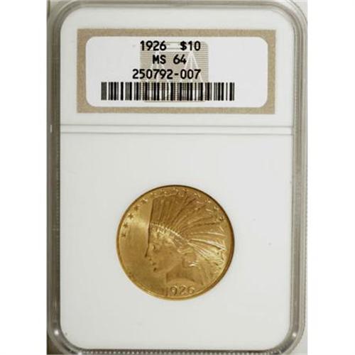 <B>1926 $10 MS64 NGC.</B></I> NGC Census: (3101/599). PCGS Population (2315/277). Mintage: 1,014,000. Numismedia Wsl. Price for NGC/PCGS coin in MS64: $2,150. (#8882)<BR><BR><B>Coin Engraver:</B> Augustus Saint-Gaudens<BR><BR><b>Shipping:</b> Coins & Currency (<a target="_blank" href="http://www.heritageauctions.com/common/shipping.php">view shipping information</a>)
