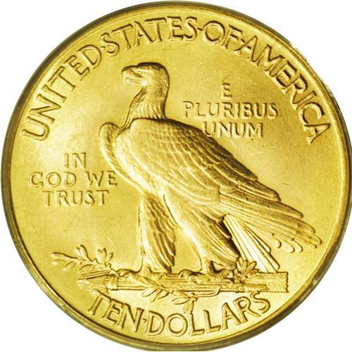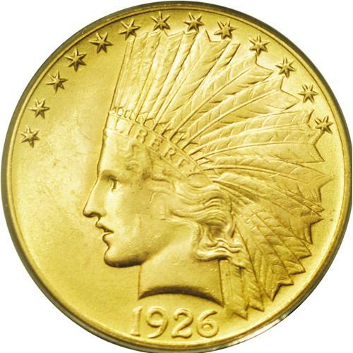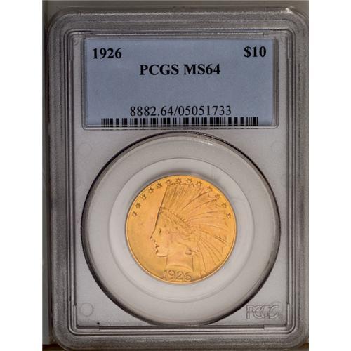 <B>1926<$10> MS64 PCGS.</B></I> A pleasing combination of yellow and pink-golden patina has gathered over each side. Generally well struck overall with a little localized weakness. Several bagmarks have collected overall that limit the grade.
