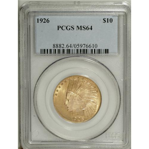 <B>1926 $10 MS64 PCGS.</B></I> A softly lustrous yellow-gold example of this popular type issue. This Choice example has few marks overall, though a handful of light abrasions are present in the left obverse field.<BR><BR><b>Shipping:</b> Coins & Currency (<a target="_blank" href="http://www.heritageauctions.com/common/shipping.php">view shipping information</a>)