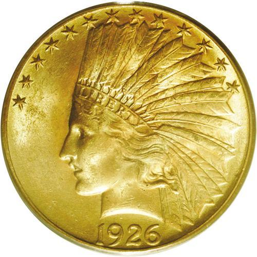 <B>1926<$10> MS64 PCGS.</B></I> Brilliant luster blazes through rich golden-orange color that is accented with sky-blue and golden patina in a variegated fashion. What is even more eye appealing is that the colors take on different shades when the coin is rotated under a light source. The boldly impressed surfaces add to the attractiveness of this example. A number of small abrasions overall are mentioned for accuracy and serve to limit the grade.