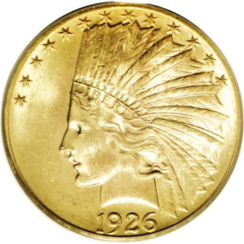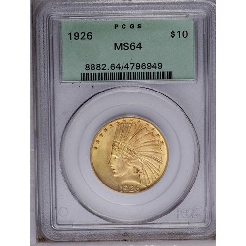 <B>1926<$10> MS64 PCGS.</B></I> Copper-gold patina with highpoint hints of hazel covers the lustrous surfaces, which yield a few small abrasions that prevent a Gem ranking. Appealing, and certified in a green label holder. <BR><BR><B>Important notice:</B> Heritage usually auctions material at the rate of 200-250 lots per hour. On some occasions eBay Live bid software or the Internet may not be able to keep up with the pace of the auction. We recommend placing a realistic absentee bid now as insurance to avoid disappointment. Occasionally the auctioneer may eliminate or reject an eBay Live bid, and the auctioneer may also reopen a lot after the close of the eBay live bidding (usually because we missed an audience bid), and may reject your bid even if it shows you as the winning bidder. By bidding via eBay Live, you agree that Heritage may award the lot to another bidder at its sole discretion under the circumstances described above or any other reasonable circumstances. Since eBay bids are not shown to us until we open the lot on the floor, we treat those bids just like floor bids. In most cases the floor responds before the eBay bid is presented to us, due to Internet lag time, so for consistency we have made it a policy that floor bids are always considered first over tie eBay live bids. Also please note that all Heritage lots purchased through eBay Live carry a 20% Buyer's Premium. Please make sure you read the Terms and Conditions before you bid. This lot is being auctioned in conjunction with a live floor auction by Heritage Galleries & Auctioneers. All final auction and invoice information will be supplied by Heritage Galleries & Auctioneers, and all other information should be considered preliminary. Lot:4149 <BR><BR><B>Winning Notification and Billing:</B> After the FINAL session in this auction is complete, Heritage will send e-mail and snail mail invoices. This process normally takes several days. All final auction and invoice information will be supplied by Heritage Galleries & Auctioneers, and all other information should be considered preliminary. <BR><BR>This auction will be conducted on a live auction floor and over the Internet through eBay Live. If you choose to place an absentee bid, please take a moment to <font color='#0000ff'><u><a href='http://pages.ebay.com/liveauctions/help/before/laabsentee.html'>learn how eBay Live absentee bidding works</a></u></font><font color='#000000'>