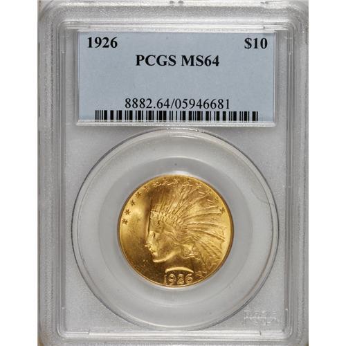 <B>1926 $10 MS64 PCGS.</B></I> The 1926 is one of the two most available issues for the series, and type collectors keep it in demand. This frosty near-Gem, solidly struck with few marks for the grade, is an appealing representative.<BR><BR><b>Shipping:</b> Coins & Currency (<a target="_blank" href="http://www.heritageauctions.com/common/shipping.php">view shipping information</a>)