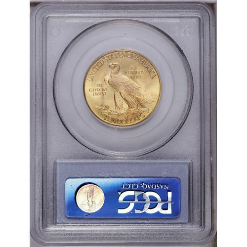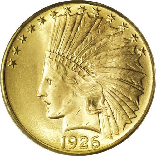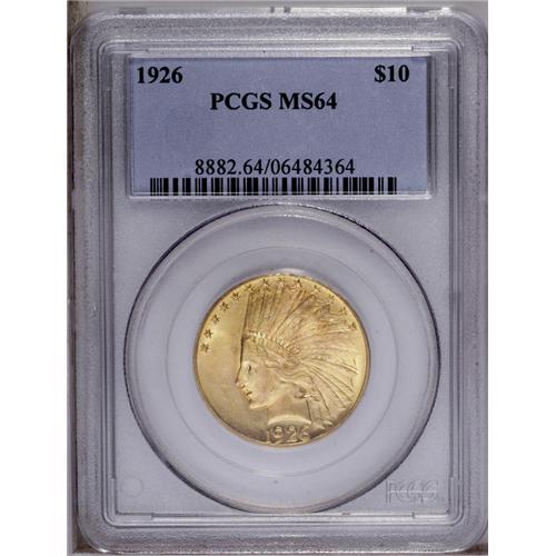 <B>1926<$10> MS64 PCGS.</B></I> The 1926 is the second most common date of the Indian Head type after the 1932. Thousands of Mint State pieces are known, and specimens are available with regularity in all Mint State grades up to and including MS64. The near-Gem offered here displays shimmering luster and variegated orange, yellow, and green-gold patination. The design elements exhibit sharp impressions throughout. The grade is defined by small contact marks on the Indian's cheek and neck and on the eagle.