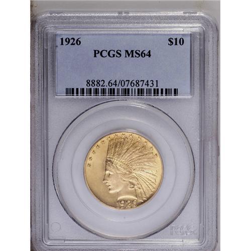 <B>1926<$10> MS64 PCGS.</B></I> The 1926 is the second most common date of the Indian Head type. This near-Gem example exhibits bright peach-gold luster and crisply impressed design features, especially the feathers of the headdress and the Indian's hair. A few small marks on the cheek and neck and in the right reverse field prevent a higher grade. This piece generates considerable "flash."