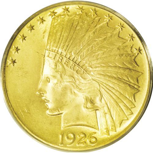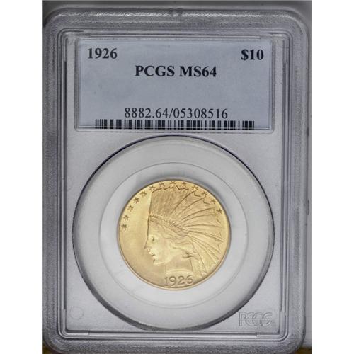 <B>1926<$10> MS64 PCGS.</B></I> The fields have bright yellow-gold color, while the devices have suggestions of pinkish patina. A well struck and flashy near-Gem with typically marked surfaces.