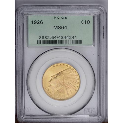 <B>1926<$10> MS64 PCGS.</B></I> This older holder near-Gem is lustrous, boldly struck, and displays attractive lime and peach hues. The fields are well preserved, although close inspection reveals marks on Liberty's chin and the eagle's front leg.