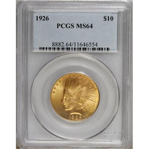 <B>1926 $10 MS64 PCGS.</B></I> Lovely lime-gold and rose toning is illuminated by intense, shimmering luster. The design motifs are boldly struck. A handful of minor abrasions on each side preclude a higher grade assessment. A popular issue for type purposes. <BR><BR><b>Shipping:</b> Coins & Currency (<a target="_blank" href="http://www.heritageauctions.com/common/shipping.php">view shipping information</a>)