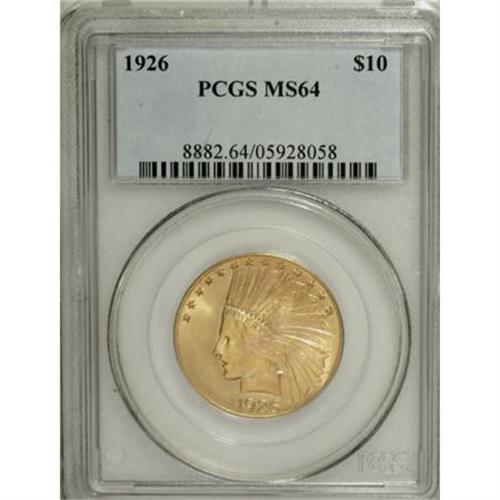 <B>1926 $10 MS64 PCGS.</B></I> The obverse of this attractive type piece is straw-gold with a touch of clover-green, while the reverse has a richer butter-yellow appearance. Well-defined with faint, scattered marks that preclude a finer grade.<BR><BR><B>Coin Engraver:</B> Augustus Saint-Gaudens<BR><BR><b>Shipping:</b> Coins & Currency (<a target="_blank" href="http://www.heritageauctions.com/common/shipping.php">view shipping information</a>\)