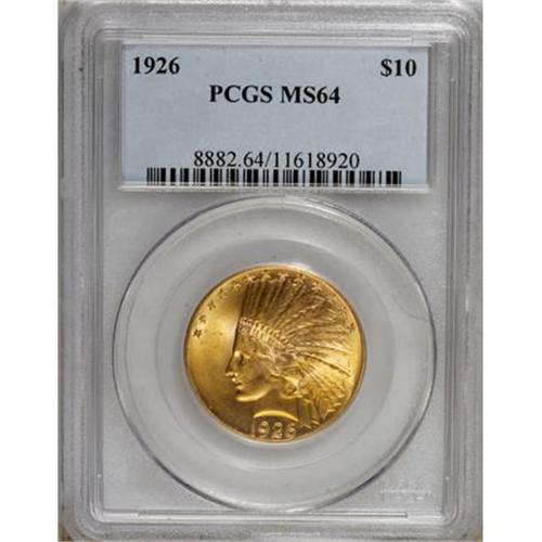 <B>1926 $10 MS64 PCGS.</B></I> Invigorating luster embraces the peach-gold faces of this near-Gem ten dollar piece, and a well directed strike brings out nice definition on the motifs. The grade is defined by a few small marks on each side.<BR><BR><B>Coin Engraver:</B> Augustus Saint-Gaudens<BR><BR><b>Shipping:</b> Coins & Currency (<a target="_blank" href="http://www.heritageauctions.com/common/shipping.php">view shipping information</a>)