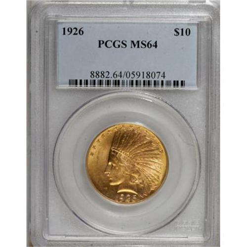 <B>1926 $10 MS64 PCGS.</B></I> Bright, effulgent luster radiates from the rose-gold surfaces. The design details are sharply produced throughout. A modicum of small abrasions confirm the near-Gem grade level. <BR><BR><B>Coin Engraver:</B> Augustus Saint-Gaudens<BR><BR><b>Shipping:</b> Coins & Currency (<a target="_blank" href="http://www.heritageauctions.com/common/shipping.php">view shipping information</a>)