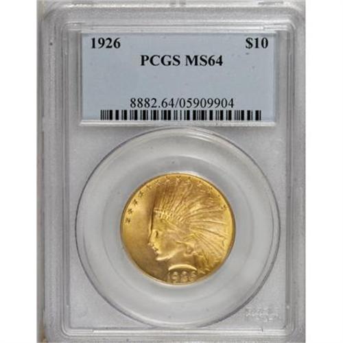 <B>1926 $10 MS64 PCGS.</B></I> A lovely green-gold near-Gem that boasts a well struck portrait and only minor blending of detail on the left border of the eagle's front wing. Booming luster sweeps clean surfaces.<BR><BR><B>Coin Engraver:</B> Augustus Saint-Gaudens<BR><BR><b>Shipping:</b> Coins & Currency (<a target="_blank" href="http://www.heritageauctions.com/common/shipping.php">view shipping information</a>)
