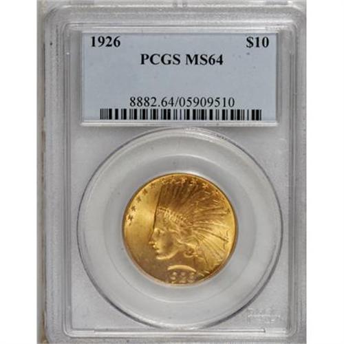 <B>1926 $10 MS64 PCGS.</B></I> Lime and orange hues invigorate this ebulliently lustrous and decisively struck gold type coin. Minor ticks on the chin and a slender vertical mark beneath the motto are consistent with the grade.<BR><BR><B>Coin Engraver:</B> Augustus Saint-Gaudens<BR><BR><b>Shipping:</b> Coins & Currency (<a target="_blank" href="http://www.heritageauctions.com/common/shipping.php">view shipping information</a>)