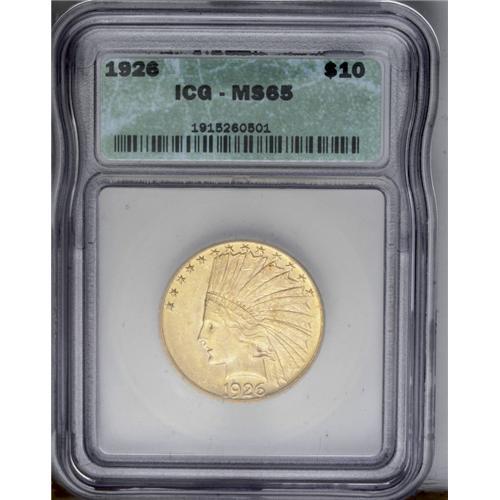 1926 $10 MS65 ICG. Typically struck with satiny, granu 1926