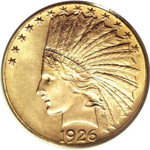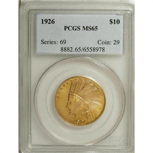 <B>1926 $10 MS65 PCGS.</B></I> One of only two Indian ten dollar issues from the 1920s. The other, the 1920-S, is one of the keys to the series and difficult in all grades. Even though the 1926 issue is more available in Gem condition than most other dates, it curious to note that finer specimens are rare. As of (3/08) PCGS has certified a mere eight coins finer than MS65, with none grading better than MS66. Velvety luster and light peach-gold coloration are the highlights of this well struck piece. <BR><BR><B>Coin Engraver:</B> Augustus Saint-Gaudens<BR><BR><b>Shipping:</b> Coins & Currency (<a target="_blank" href="http://www.heritageauctions.com/common/shipping.php">view shipping information</a>)