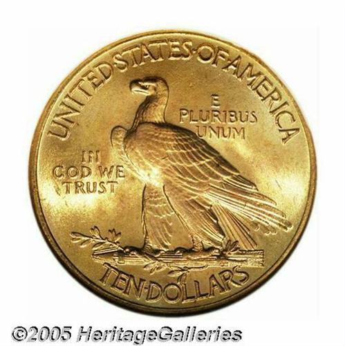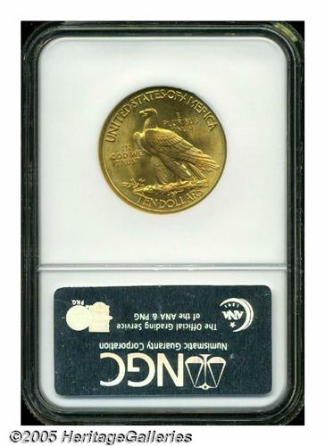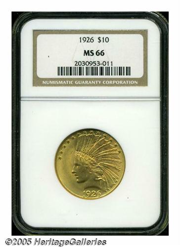 <B>1926<$10> MS66 NGC.</B></I> As common as this date is in the lower grades of Mint State, it is surprisingly difficult to locate in MS66 condition. Only 30 other pieces have been so graded by NGC with none finer at either service (4/05). The striking details are sharply defined throughout and the yellow-gold surfaces show a pronounced overlay of rich red patina. Soft, frosted mint luster covers each side of this special, high grade type coin.
