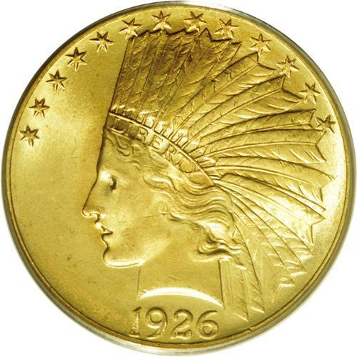 <B>1926<$10> MS66 PCGS.</B></I> Ex: Duckor. The 1926 ten dollar, unlike many other eagles, does not appear to have been extensively melted. Rather, many apparently resided in European banks for foreign exchange transactions. Occasional hoards of this date have appeared on the market over the past several decades, providing an ample supply to meet collector demand. This is evident from the certified population figures that show more than 35,000 coins in the various grades of Mint State. It is not until the MS66 plateau is reached that the 1926 becomes a condition rarity. Only 40 pieces have been so graded by PCGS and NGC to date. It is significant that, unlike other, much rarer dates such as the 1908-S, 1913-S, and 1930-S, no examples are known in higher grades.<BR> The Premium Gem 1926 eagle offered here displays a breathtaking melange of apricot, yellow, and greenish-gold patination, and dazzling luster. A sharp strike is noted on the design elements, with no areas revealing hints of weakness. A few small linear marks are seen on the Indian's cheek, with another beneath the last A of AMERICA, and one on the left (right facing) eagle's leg. The latter two may serve as pedigree markers. Population: 7 in 66, 0 finer (3/06).<BR><I>Indian Eagle Selections from the Dr. Steven L. Duckor Collection.</B></I> <BR><BR><B>Important notice:</B> Heritage usually auctions material at the rate of 200-250 lots per hour. On some occasions eBay Live bid software or the Internet may not be able to keep up with the pace of the auction. We recommend placing a realistic absentee bid now as insurance to avoid disappointment. Occasionally the auctioneer may eliminate or reject an eBay Live bid, and the auctioneer may also reopen a lot after the close of the eBay live bidding (usually because we missed an audience bid), and may reject your bid even if it shows you as the winning bidder. By bidding via eBay Live, you agree that Heritage may award the lot to another bidder at its sole discretion under the circumstances described above or any other reasonable circumstances. Since eBay bids are not shown to us until we open the lot on the floor, we treat those bids just like floor bids. In most cases the floor responds before the eBay bid is presented to us, due to Internet lag time, so for consistency we have made it a policy that floor bids are always considered first over tie eBay live bids. Also please note that all Heritage lots purchased through eBay Live carry a 20% Buyer's Premium. Please make sure you read the Terms and Conditions before you bid. This lot is being auctioned in conjunction with a live floor auction by Heritage Galleries & Auctioneers. All final auction and invoice information will be supplied by Heritage Galleries & Auctioneers, and all other information should be considered preliminary. Lot:3896 <BR><BR><B>Winning Notification and Billing:</B> After the FINAL session in this auction is complete, Heritage will send e-mail and snail mail invoices. This process normally takes several days. All final auction and invoice information will be supplied by Heritage Galleries & Auctioneers, and all other information should be considered preliminary. <BR><BR>This auction will be conducted on a live auction floor and over the Internet through eBay Live. If you choose to place an absentee bid, please take a moment to <font color='#0000ff'><u><a href='http://pages.ebay.com/liveauctions/help/before/laabsentee.html'>learn how eBay Live absentee bidding works</a></u></font><font color='#000000'>