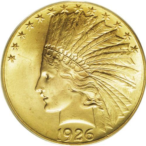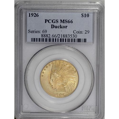 <B>1926 $10 MS66 PCGS.</B></I> Ex: Duckor. The 1926 ten dollar, unlike many other eagles, does not appear to have been extensively melted. Rather, many apparently resided in European banks for foreign exchange transactions. Occasional hoards of this date have appeared on the market over the past several decades, providing an ample supply to meet collector demand. This is evident from the certified population figures that show more than 35,000 coins in the various grades of Mint State. It is not until the MS66 plateau is reached that the 1926 becomes a condition rarity. Only 42 pieces have been so graded by PCGS and NGC to date. It is significant that, unlike other, much rarer dates such as the 1908-S, 1913-S, and 1930-S, no examples are known in higher grades.<BR> The Premium Gem 1926 eagle offered here displays a breathtaking melange of apricot, yellow, and greenish-gold patination, and dazzling luster. A sharp strike is noted on the design elements, with no areas revealing hints of weakness. A few small linear marks are seen on the Indian's cheek, with another beneath the last A of AMERICA, and one on the left (right facing) eagle's leg. The latter two may serve as pedigree markers. PCGS Population: 8 in 66, 0 finer (10/06).<BR><BR><b>Shipping:</b> Coin/Currency (<a target="_blank" href="http://www.heritageauctions.com/common/shipping.php">view shipping information</a>)