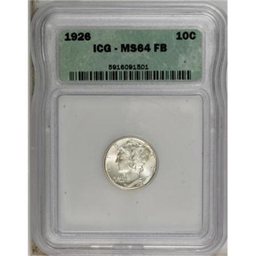<B>1926 10C MS64 Full Bands ICG.</B></I> NGC Census: (139/112). PCGS Population (225/207). Mintage: 32,160,000. Numismedia Wsl. Price for NGC/PCGS coin in MS64: $160. (#4955)<BR><BR><B>Coin Engraver:</B> Adolph A. Weinman<BR><BR><b>Shipping:</b> Coins & Currency (<a target="_blank" href="http://www.heritageauctions.com/common/shipping.php">view shipping information</a>)