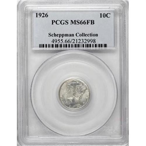 <B>1926 10C MS66 Full Bands PCGS.</B></I> Ex: Jay Eisenberg. Light golden toning on the obverse with a white reverse and fully developed features. A tiny dot of deeper patina appears below IN GOD WE TRUST. Powerful luster and strong eye appeal.<BR><I>From The Scheppman Collection, #4 PCGS Registry of Full Band Mercury Dimes.</B></I><BR><BR><B>Coin Engraver:</B> Adolph A. Weinman<BR><BR><b>Shipping:</b> Coins & Currency (<a target="_blank" href="http://www.heritageauctions.com/common/shipping.php">view shipping information</a>)