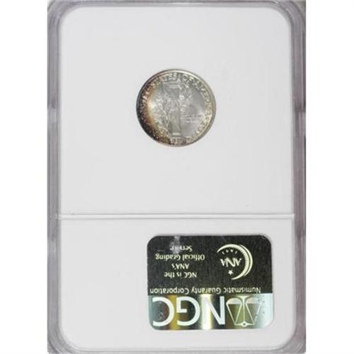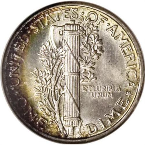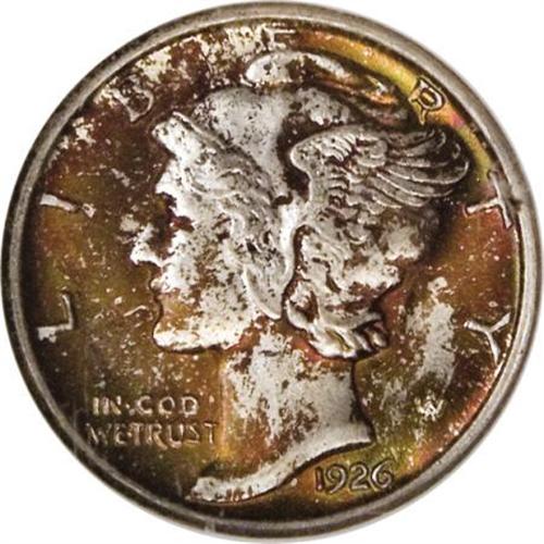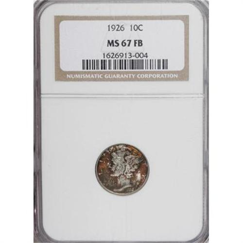 <B>1926 10C MS67 Full Bands NGC.</B></I> The '26 Philadelphia issue, with its generous mintage of over 32 million pieces, is relatively common, as one would expect. All grades through MS65 are readily available, though pieces in loftier states of preservation are more elusive. The MS67 example we offer here is exquisitely struck, resulting in the Full Bands designation. The obverse fields display crimson-orange and lime-green coloration, highlighting Mercury's portrait, which is mostly untoned. A crescent of crimson-orange and lime-green toning bathes the left reverse margin. Lustrous surfaces are lovingly preserved on each side. Census: 8 in 67 Full Bands, 0 finer (6/07). <BR><BR><b>Shipping:</b> Coins & Currency (<a target="_blank" href="http://www.heritageauctions.com/common/shipping.php">view shipping information</a>)