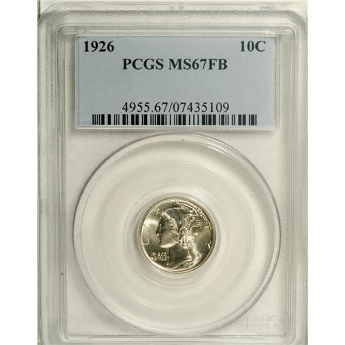 <B>1926 10C MS67 Full Bands PCGS.</B></I> The obverse is nearly untoned, while the reverse has a hint of smoky gold coloration. Boldly lustrous on both sides, and elusive with Full Bands designation. This piece is one of 13 coins so certified at PCGS, with none finer (1/07).<BR><BR><b>Shipping:</b> Coins & Currency (<a target="_blank" href="http://www.heritageauctions.com/common/shipping.php">view shipping information</a>)