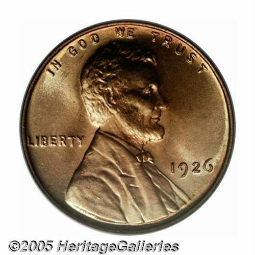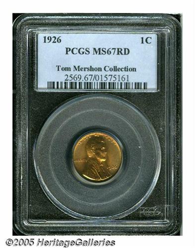 <B>1926<1C> MS67 Red PCGS.</B></I> Bright gold patina overlays strong luster with some pale mint-green color near the borders. Sharply struck, with marvelously preserved surfaces. This specimen generates tremendous eye appeal. Population: 51 in 67, 0 finer (3/05).<BR><I>From The Tom Mershon #2 All-Time PCGS Registry Set of Lincoln Wheat Cents.</B></I>