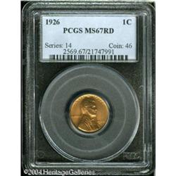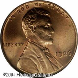1926 1C MS67 Red PCGS. Exceptional color and overa <B>1926 1C MS67 Red PCGS.</B></I> Exceptional color and overall preservation of surfaces, this is a high-end coin even for an MS67. The 1926 is one of the more commonly encountered dates from the 1920s, as well as one of the best produced, and as such it is often a choice for type collectors. Population: 49 in 67, 0 finer (11/04). <BR><BR><B>Important notice:</B> Heritage usually auctions material at the rate of 200-250 lots per hour. On some occasions eBay Live bid software or the Internet may not be able to keep up with the pace of the auction. We recommend placing a realistic absentee bid now as insurance to avoid disappointment. Occasionally the auctioneer may eliminate or reject an eBay Live bid, and the auctioneer may also reopen a lot after the close of the eBay live bidding (usually because we missed an audience bid), and may reject your bid even if it shows you as the winning bidder. By bidding via eBay Live, you agree that Heritage may award the lot to another bidder at its sole discretion under the circumstances described above or any other reasonable circumstances. Since eBay bids are not shown to us until we open the lot on the floor, we treat those bids just like floor bids. In most cases the floor responds before the eBay bid is presented to us, due to Internet lag time, so for consistency we have made it a policy that floor bids are always considered first over tie eBay live bids. Also please note that all Heritage lots purchased through eBay Live carry a 20% Buyer's Premium. Please make sure you read the Terms and Conditions before you bid. This lot is being auctioned in conjunction with a live floor auction by Heritage Galleries & Auctioneers. All final auction and invoice information will be supplied by Heritage Galleries & Auctioneers, and all other information should be considered preliminary. Lot:5303