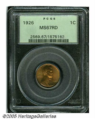 <B>1926<1C> MS67 Red PCGS.</B></I> The original orange-red coloration is accented by a significant presence of light lime green patina on each side. A high grade older holder example of this available P-mint cent. The obverse fields display crisscrossing die striations and the surfaces glow with bright, frosted mint luster. Sharply defined, and nearly immaculate save for a slender vertical mark near the U in UNITED. Population: 54 in 67, 0 finer (6/05).