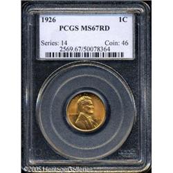 <B>1926 1C MS67 Red PCGS.</B></I> This is a sensational and Superb Gem with very sharp design features and fully brilliant orange luster. Save for a tiny spot in the right obverse field and a couple tiny nicks on letters of the reverse, the surfaces are virtually perfect. Population: 51 in 67, 0 finer (1/05). Lot:5494