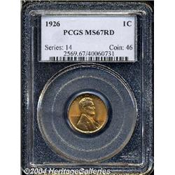 <B>1926<1C> MS67 Red PCGS.</B></I> Brilliant, golden-orange color with sharply impressed devices and essentially mark-free surfaces. No coins have been certified finer by NGC and PCGS combined (9/04). <BR><BR><B>Important notice:</B> Heritage usually auctions material at the rate of 200-250 lots per hour. On some occasions eBay Live bid software or the Internet may not be able to keep up with the pace of the auction. We recommend placing a realistic absentee bid now as insurance to avoid disappointment. Occasionally the auctioneer may eliminate or reject an eBay Live bid, and the auctioneer may also reopen a lot after the close of the eBay live bidding (usually because we missed an audience bid), and may reject your bid even if it shows you as the winning bidder. By bidding via eBay Live, you agree that Heritage may award the lot to another bidder at its sole discretion under the circumstances described above or any other reasonable circumstances. Since eBay bids are not shown to us until we open the lot on the floor, we treat those bids just like floor bids. In most cases the floor responds before the eBay bid is presented to us, due to Internet lag time, so for consistency we have made it a policy that floor bids are always considered first over tie eBay live bids. Also please note that all Heritage lots purchased through eBay Live carry a 20% Buyer's Premium. Please make sure you read the Terms and Conditions before you bid.