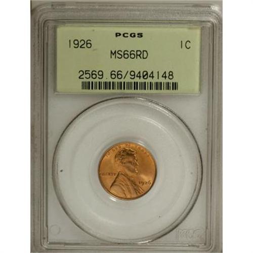 <B>1926 1C MS66 Red PCGS.</B></I> . PCGS Population (392/55). NGC Census: (185/25). Mintage: 157,088,000. Numismedia Wsl. Price for NGC/PCGS coin in MS66: $250. (#2569)<BR><BR><B>Coin Engraver:</B> Victor D. Brenner<BR><BR><b>Shipping:</b> Coins & Currency (<a target="_blank" href="http://www.heritageauctions.com/common/shipping.php">view shipping information</a>)